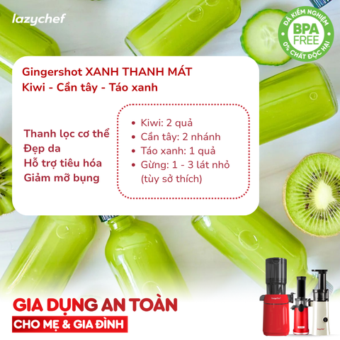 Ginger + kiwi + cần tây + táo xanh: Màu xanh nhẹ, hỗ trợ tiêu hóa, da khỏe