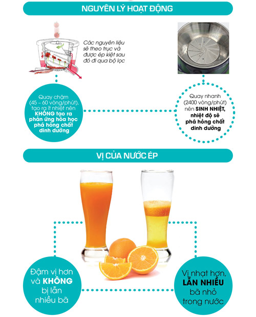 Thứ hai, máy ép chậm trục đứng thường được xay ở tốc độ cao, hoạt động nhanh nên không được vắt kiệt nước hoa quả trong lượng bã tiết ra. Nước ép bị sủi bọt và phân tầng nhanh trong 10 - 15 phút, các chất dinh dưỡng tốt như enzyme dễ bị loại bỏ và không mang lại hiệu quả dinh dưỡng cho một ly nước ép.