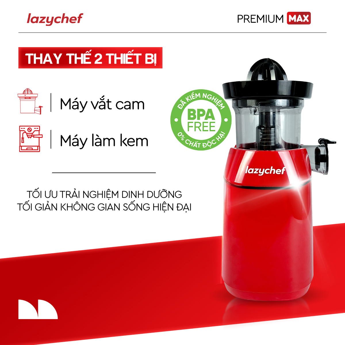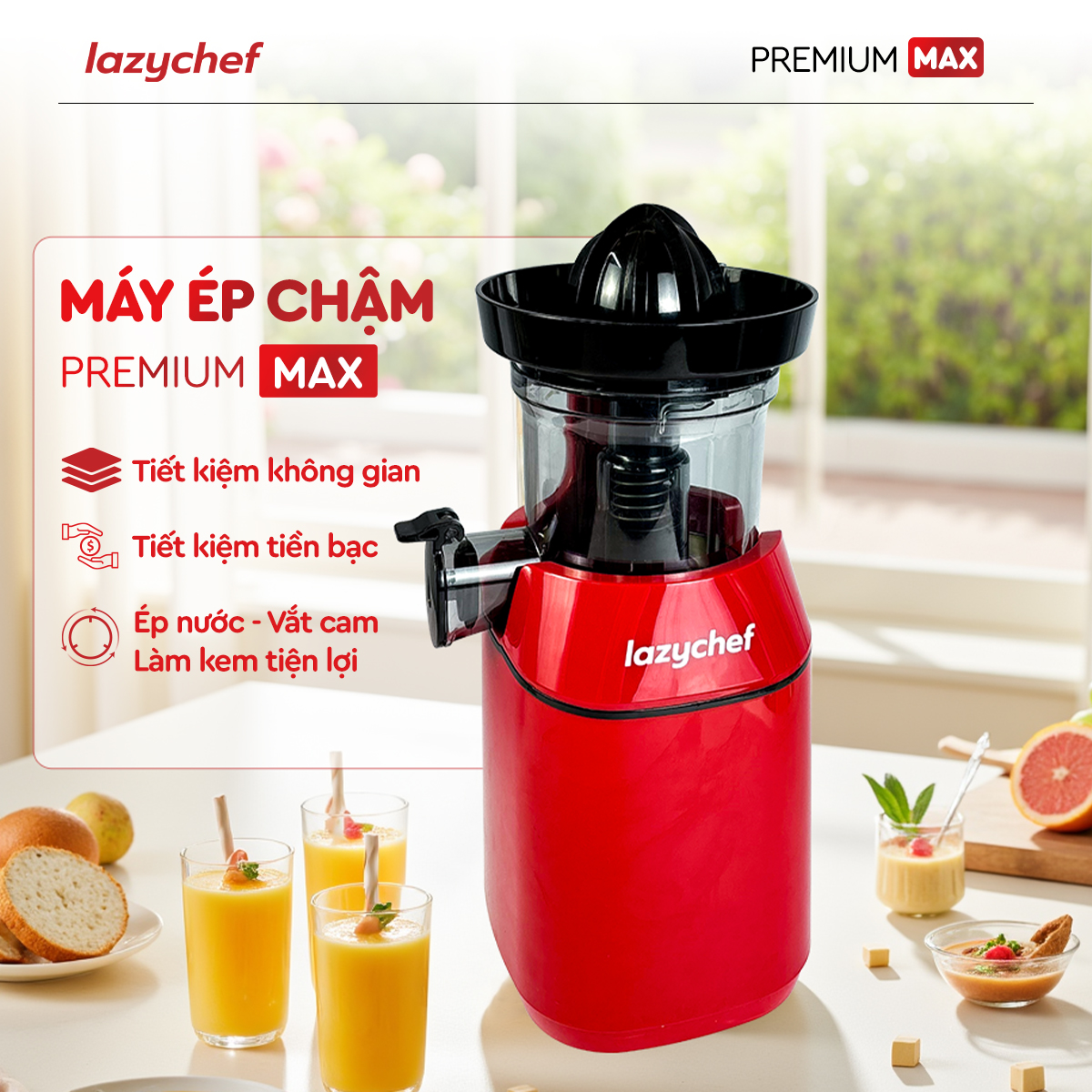 LazyChef Premium Max 3in1 là dòng máy ép chậm thế hệ mới nhất, sở hữu tính năng vắt cam chuyên dụng tích hợp trực tiếp trên thân máy – điều mà các dòng máy ép chậm truyền thống chưa làm được. Đây là giải pháp "3 trong 1" giúp tiết kiệm 50% không gian bếp và 70% thời gian chuẩn bị cho người sống healthy.