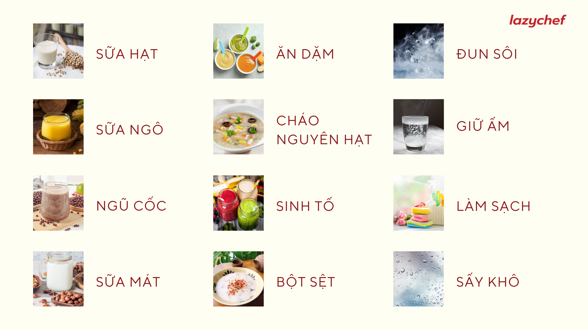Tích hợp 12 chức năng trong một máy, bạn có thể dễ dàng chế biến các món ăn ngon và bổ dưỡng cho cả nhà như: Sữa hạt, Ngũ cốc, Sữa Ngô, Sữa Mát, Ăn dặm, Cháo nguyên hạt, Sinh tố, Bột sệt, Đun sôi, Làm sạch, Giữ ấm, Sấy khô